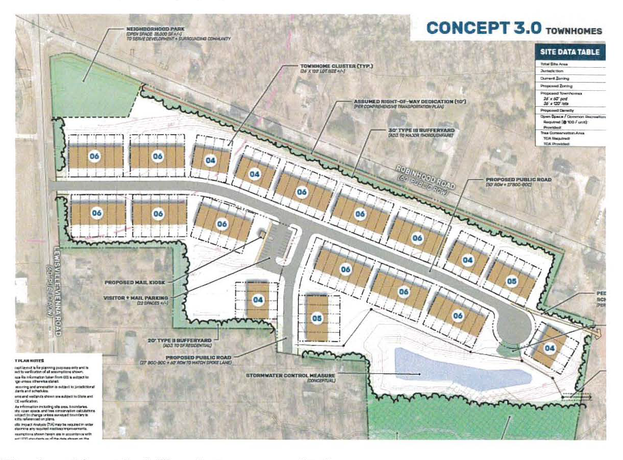 - L-115 Forestar Rezoning: a general use application to rezone (+/-) 20.4 acres of property located at the southeast corner of Lewisville-Vienna and Robinhood Roads from Residential Single-Family (RS-9) and Manufactured Housing Development (MH) to Residential Multi-Family (RM-8). The tax parcel IDs include 5886-66-4288, 5886-65-4975, 5886-65-7947, 5886-66-7263, 5886-66-0193,5886-56-8476 and 5886-56-4784. This property is located within the Lewisville Neighborhood Center Overlay. The Lewisville Planning Board will review this request and consider a recommendation to the Lewisville Town Council at its regularly scheduled meeting Wednesday, December 10 2025 at 6:00 pm.