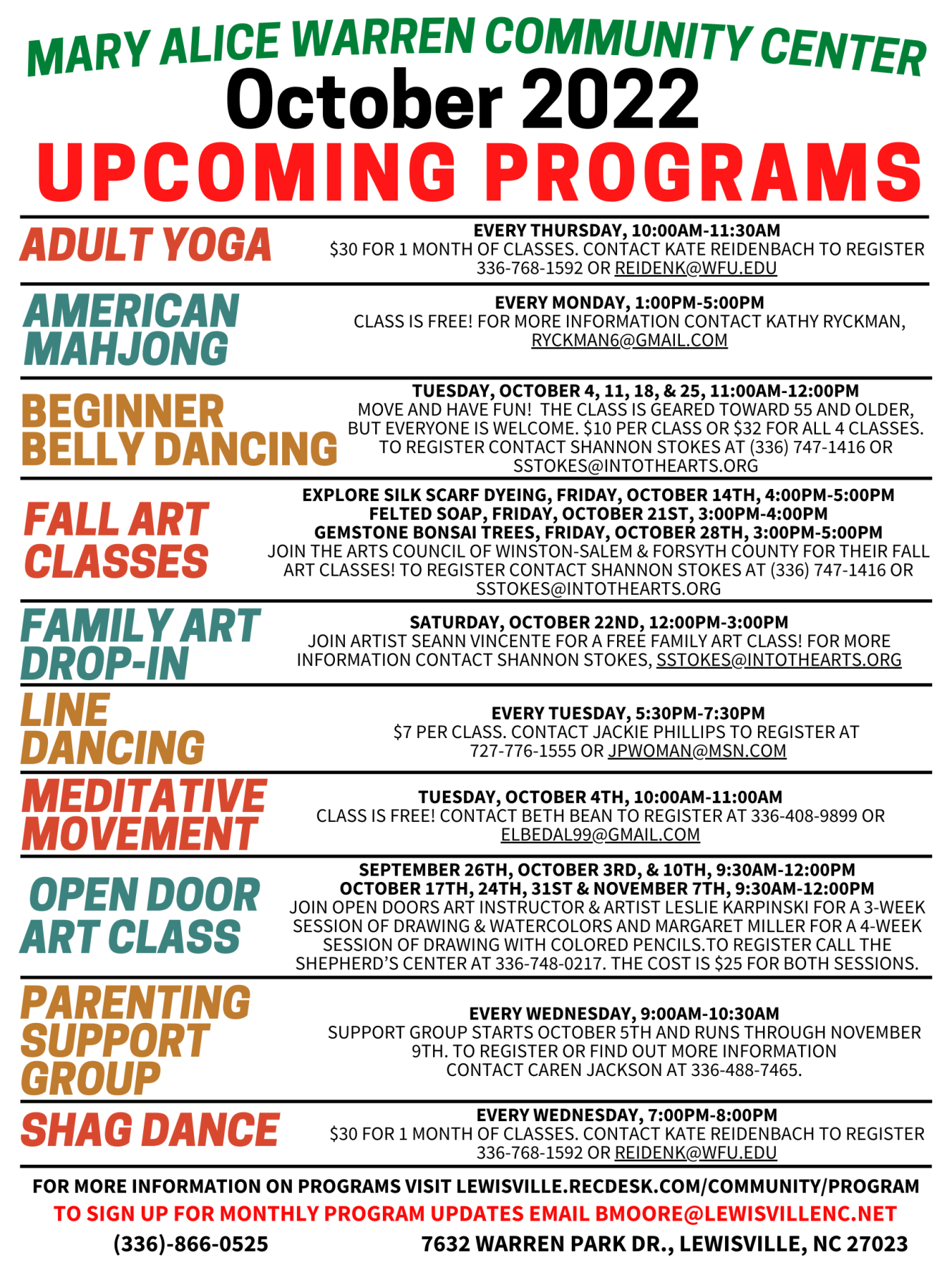 Here's a sneak peek of exciting, upcoming October classes and programs at the Mary Alice Warren Community Center.